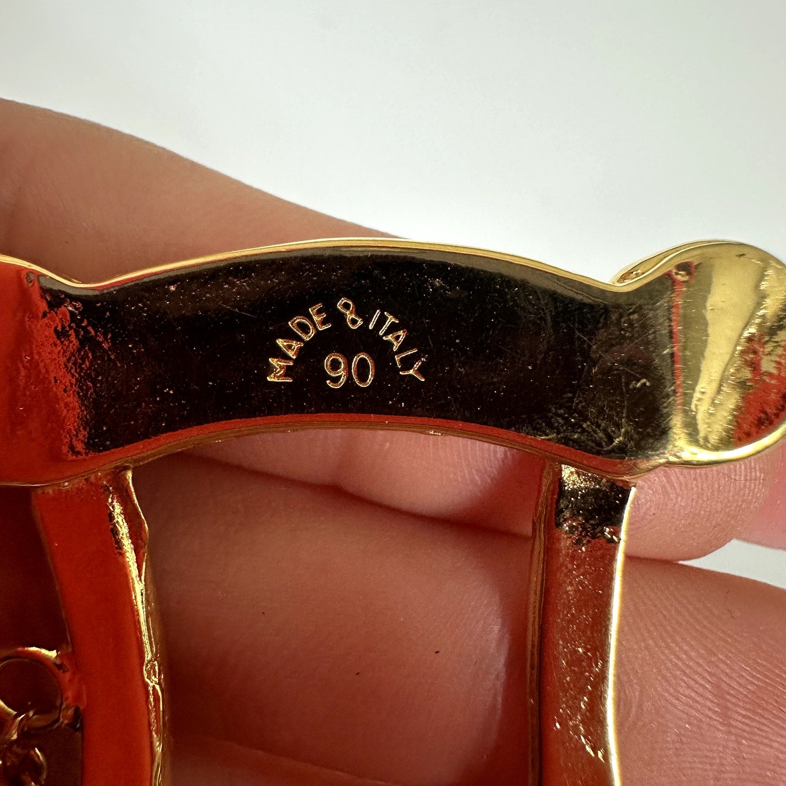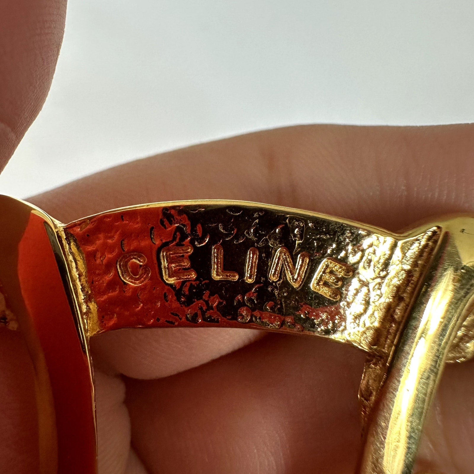Authentic vintage Céline scarf clip/brooch dated 1990 and crafted in Italy in rich gold-tone metal with an attached safety chain and bar pin closure. This elegant minimalist frame design reflects the refined, equestrian-inspired aesthetic Céline was known for in the late 1980s–early 1990s, making it a versatile accessory that can be worn on scarves, jackets, or handbags. The piece shows light surface wear consistent with age but retains strong color, shine, and fully functional hardware. A timeless collectible accent for vintage designer lovers and a sophisticated addition to any curated accessory collection.